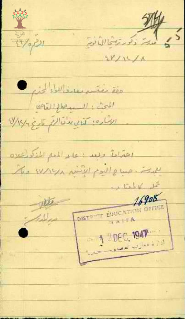 رسالة من مدير مدرسة ترشيحا الى مفتش المعارف بخصوص عودة المعلم صالح القاضي الى العمل