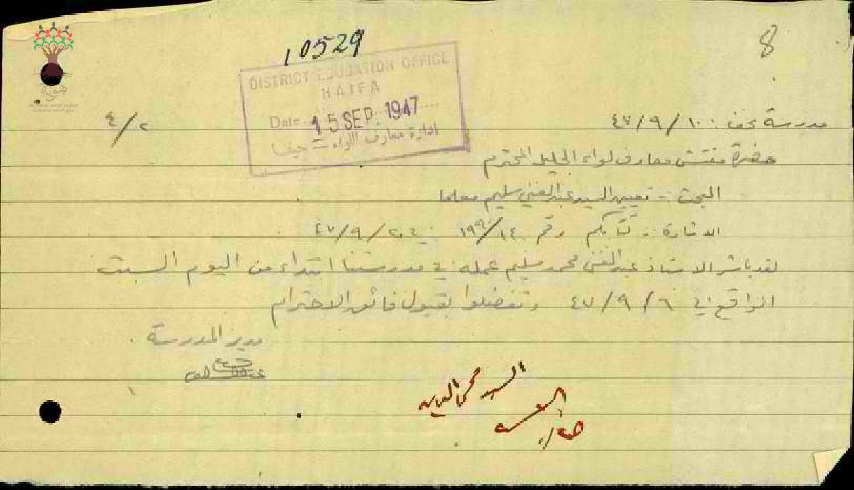 رسالة من مدير مدرسة نحف الى مفتش المعارف يخبره بأن المعلم عبد الغني طه قد باشر عمله