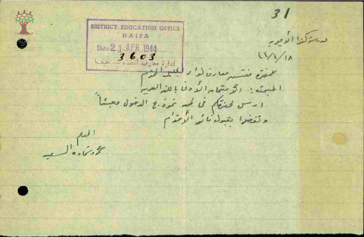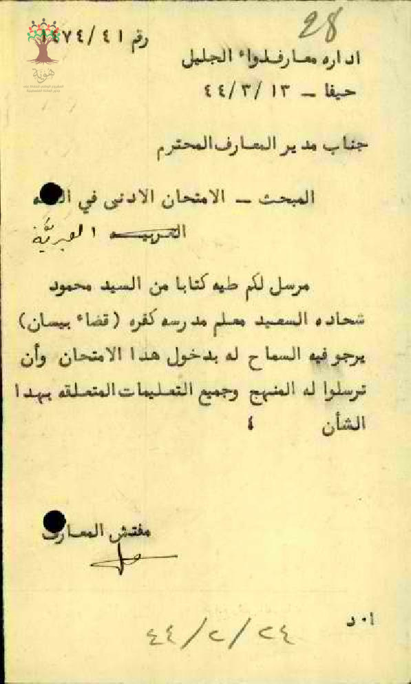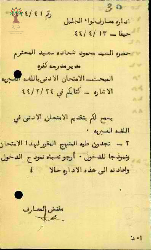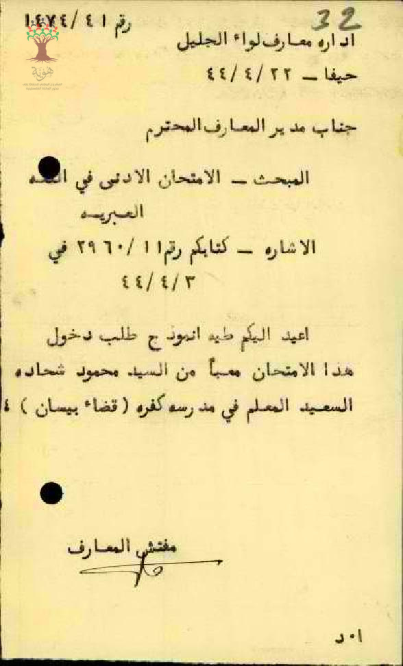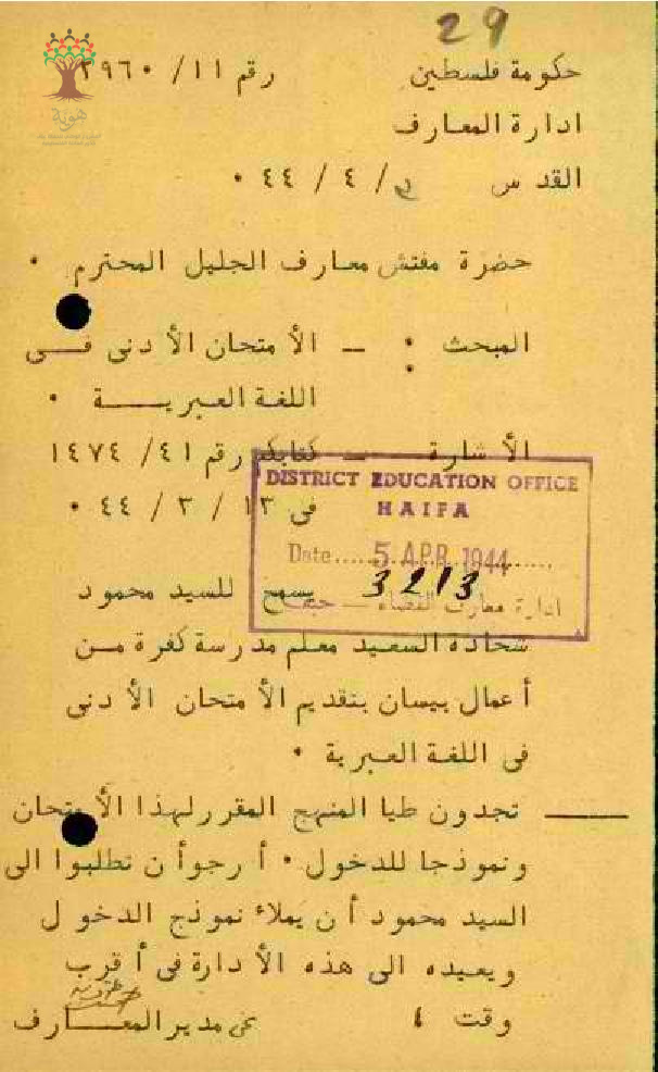 رسالة من مفتش المعارف إلى مدير المعارف يبحث معه رسالة المعلم محمود السعيد يطلب فيها السماح له بدخول الامتحان الأدنى في اللغة العبرية