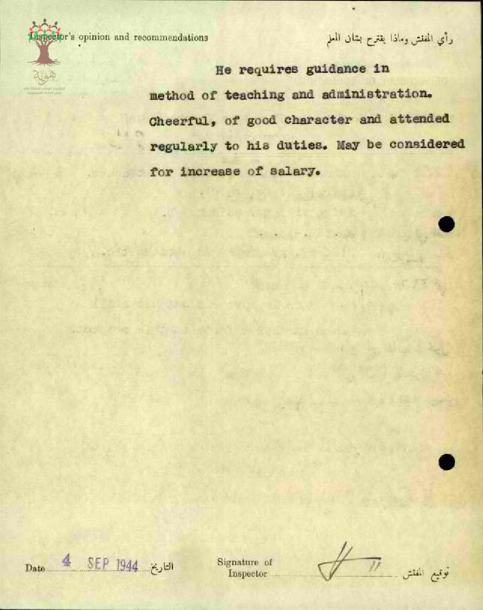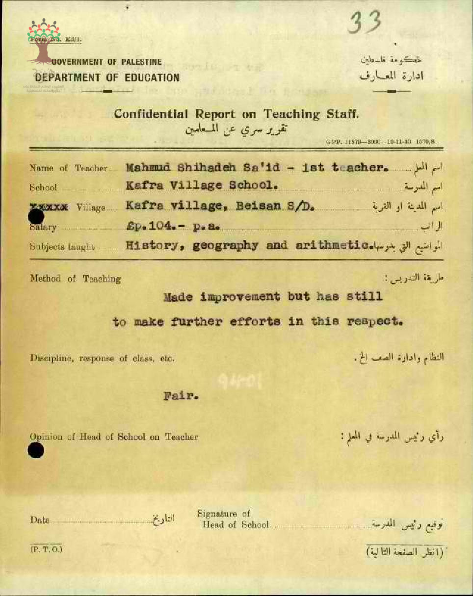 تقرير تفصيلي عن أداء المعلم محمود السعيد في مدرسة كفرا سنة 1944