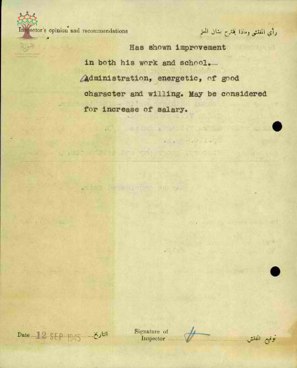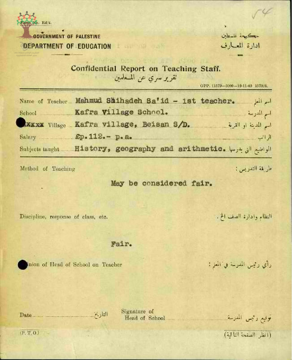 تقرير تفصيلي عن أداء المعلم محمود السعيد في مدرسة كفرا سنة 1945