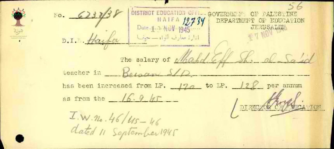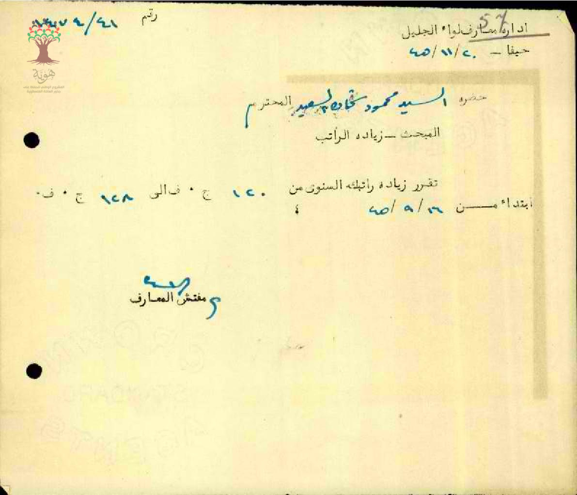 رسالة من مفتش المعارف إلى المعلم محمود السعيد يخبره بقرار زيادة راتبه السنوي