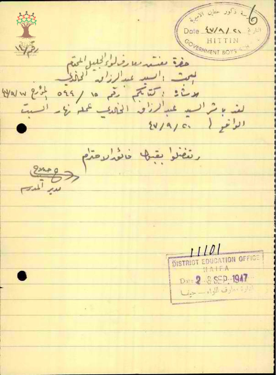 رسالة من مدير مدرسة حطين الى مفتش المعارف يخبره بأن المعلم عبد الرزاق الخالدي قد باشر عمله