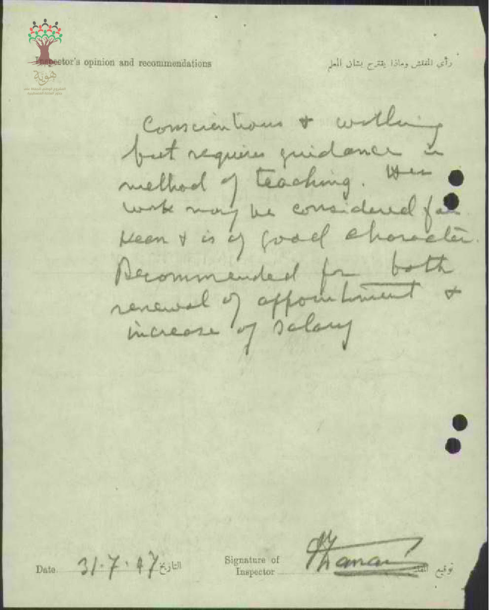 تقرير تفصيلي عن أداء المعلمة رنيه مطر في مدرسة عكا للبنات سنة 1947