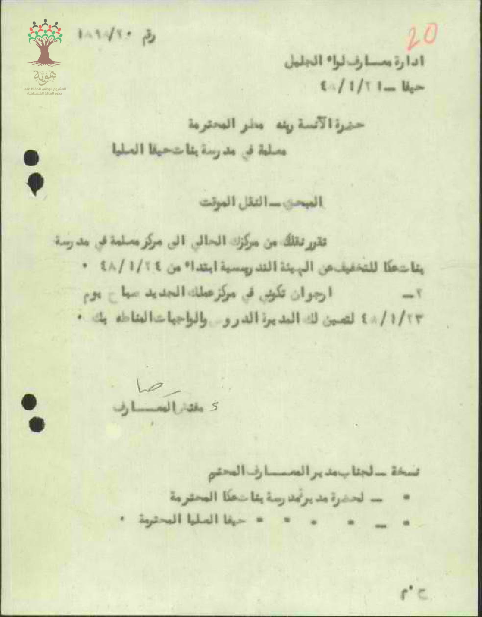 رسائل من مفتش المعارف الى المعلمة رنيه مطر بخصوص نقلها الى مدرسة حيفا
