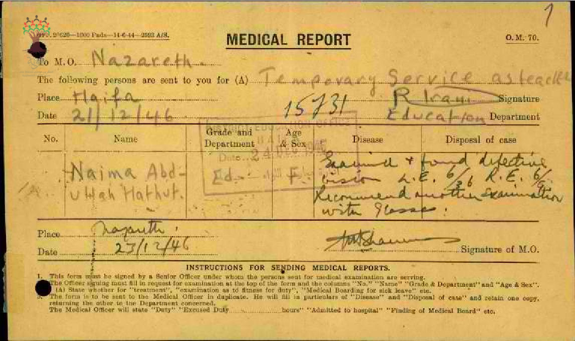 رسالة من مفتش المعارف الى المعلمة نعيمة حتحوت مرفقة بالتقرير الطبي لتعيينها