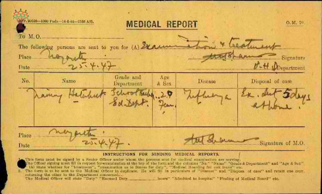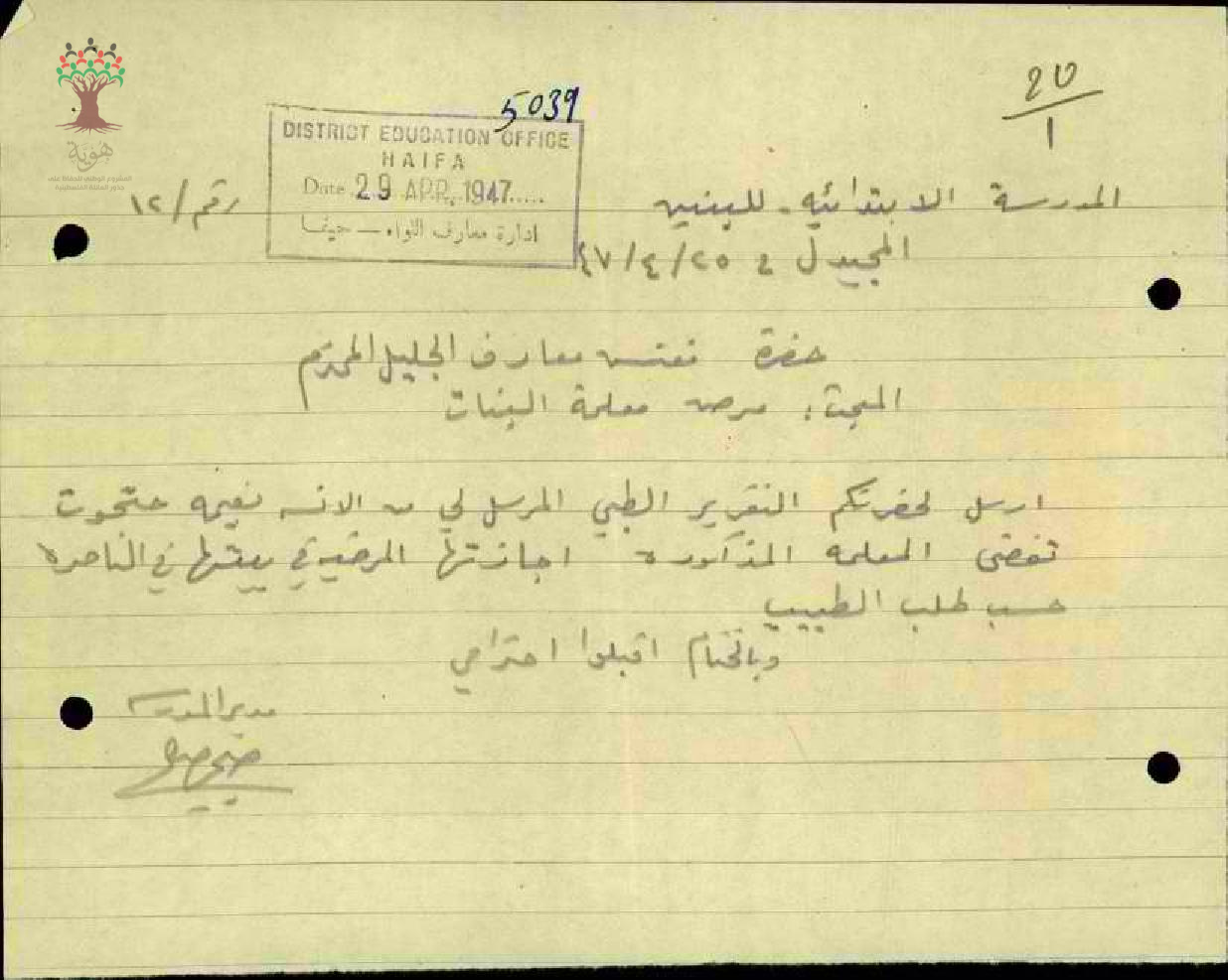 رسالة من مدير مدرسة المجيدل الى مفتش المعارف بخصوص تغيب المعلمة نعيمة حتحوت مرفقة بالتقرير الطبي