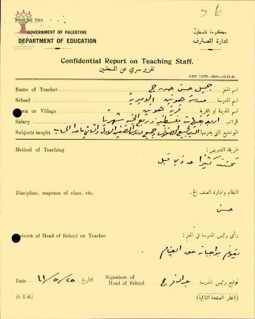 تقرير سري عن المعلم جميل حدرج في مدرسة هونين