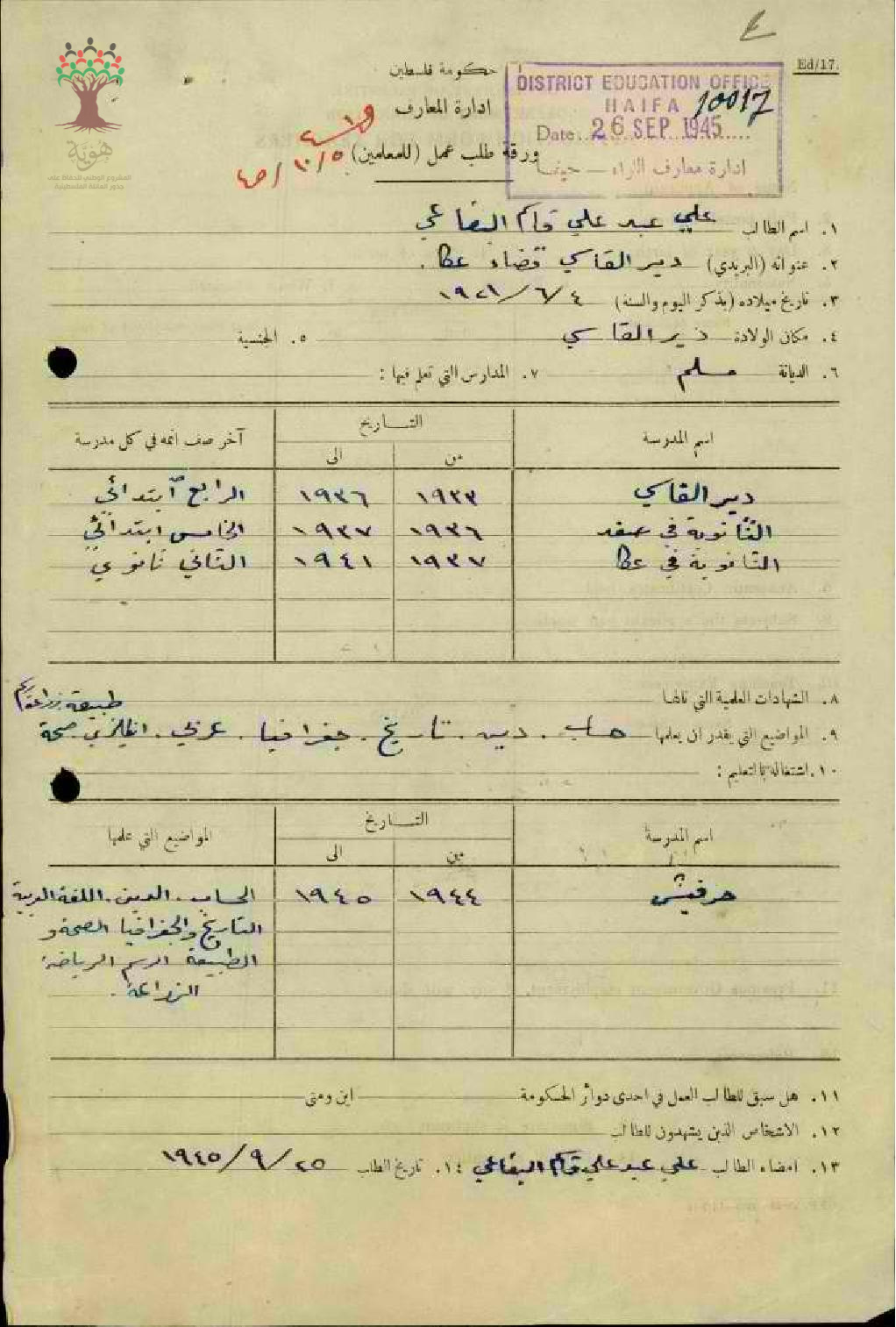 ورقة طلب عمل للمعلم علي العبد قاسم البقاعي/دير القاسي
