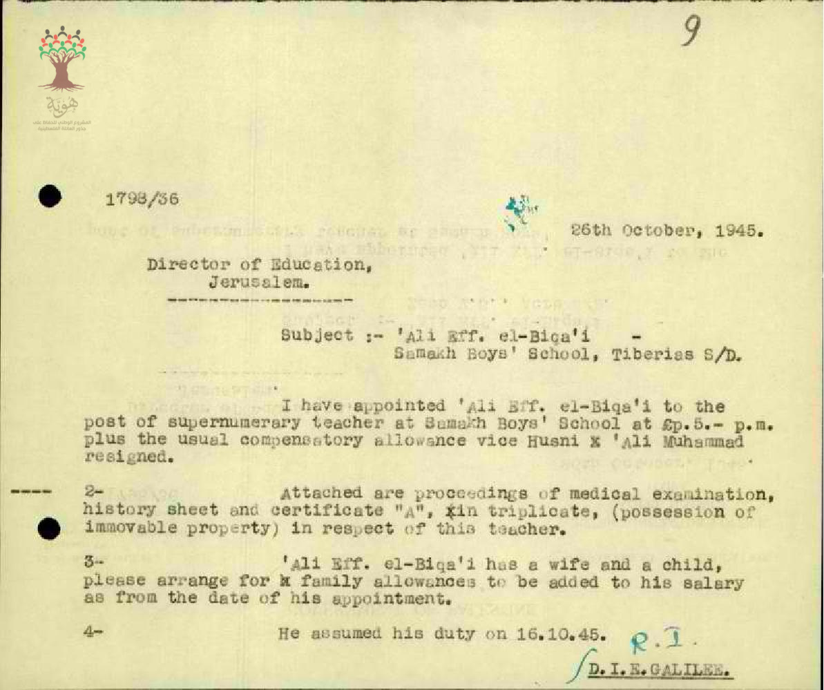 رسالة من مفتش المعارف الى مدير المعارف بخصوص تعيين المعلم علي البقاعي