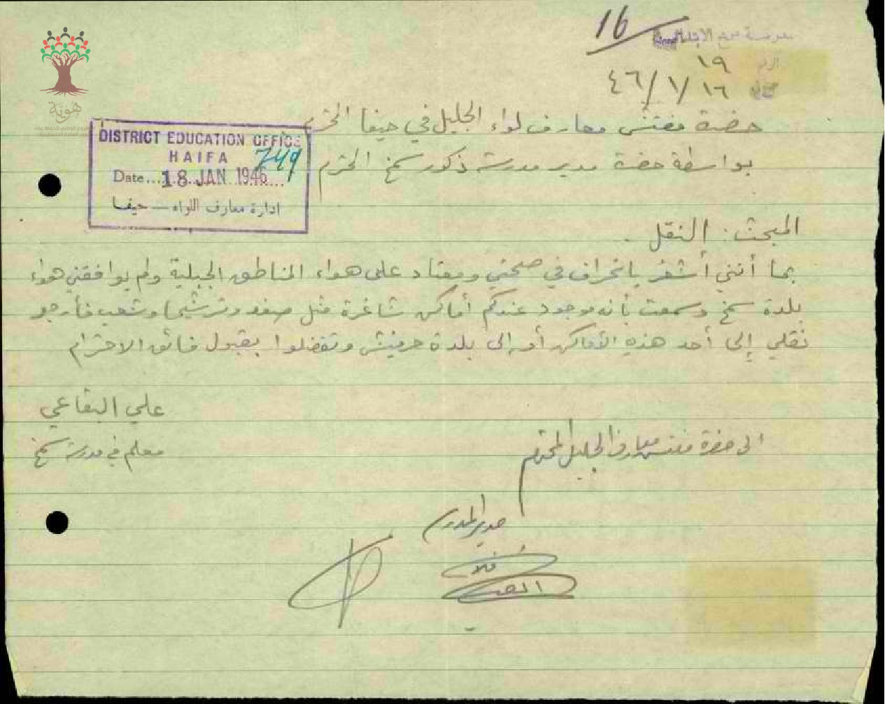 رسالة من المعلم علي البقاعي الى مفتش المعارف يطلب فيها نقله من مدرسة سمخ