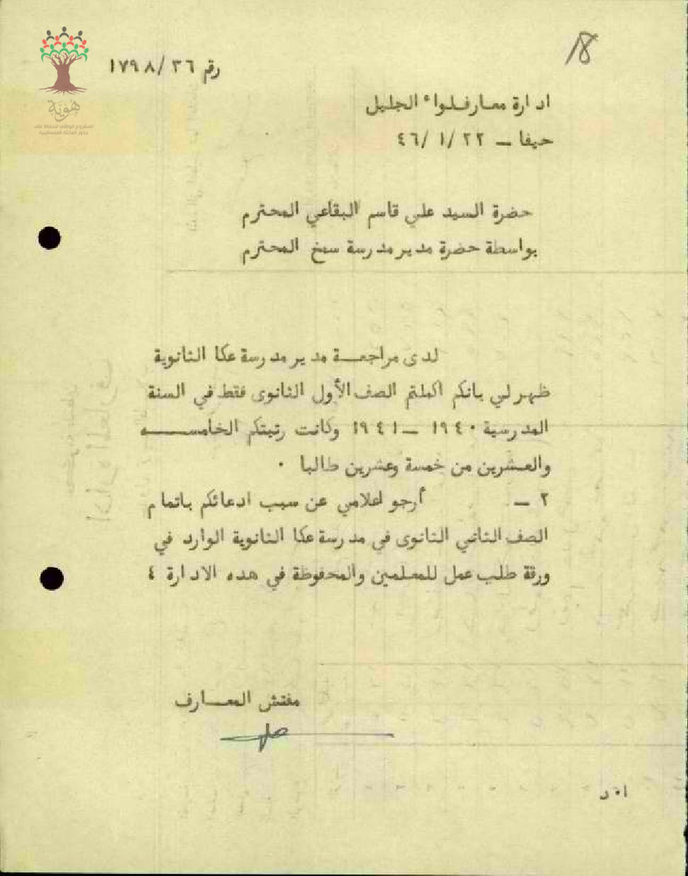 رسالة من مفتش المعارف الى المعلم علي البقاعي بخصوص شهادته الثانوية