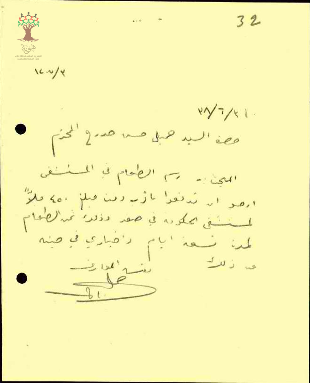 رسالة من مفتش المعارف الى حضرة السيد حميل حدرج المحترم المبحث رسم الطعام في المستشفى