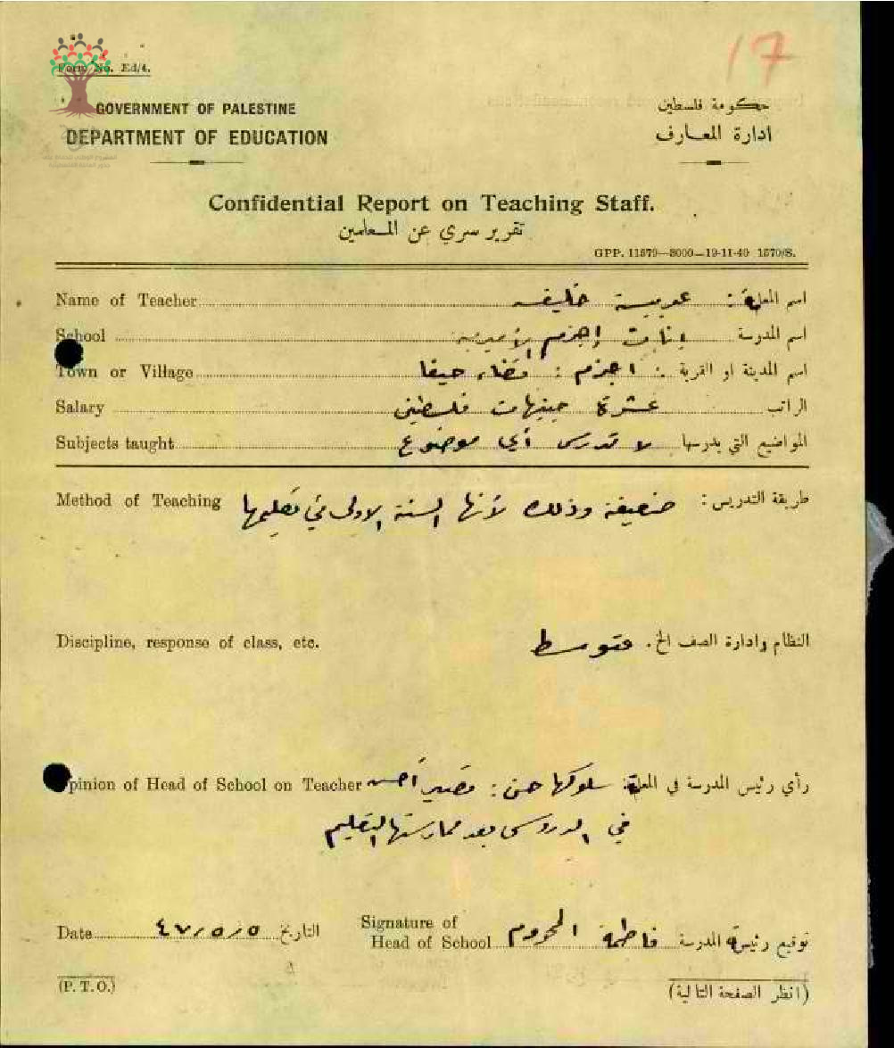رسالة من حكومة فلسطين ادارة المعارف بخصوص تقرير سري عن المعلمة عربية خليفه