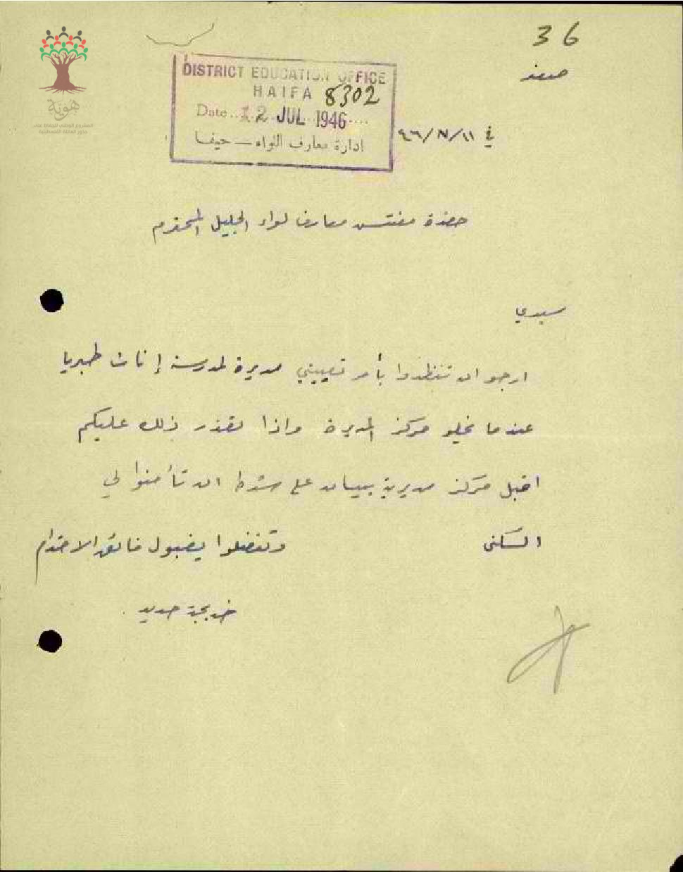 رسالة من المعلمة خديجة حديد الى مفتش معارف الجليل بخصوص النظر بامر تعيني مديرة لمدرسة