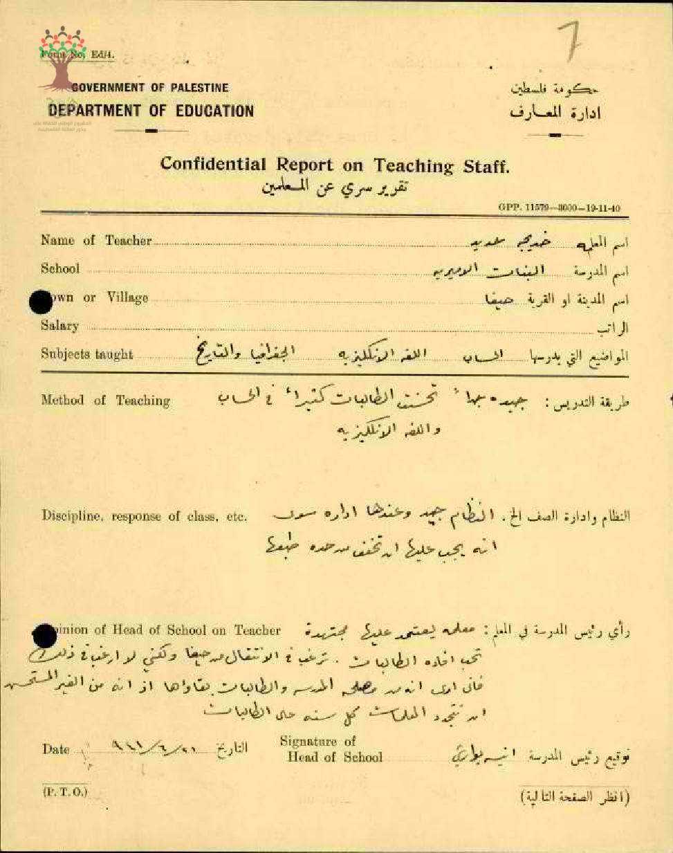 رسالة من حكومة فلسطين الى ادارة المعارف المبحث تقرير سري عن العلمة خديجة حديد في مدرسة بنات الاميرات