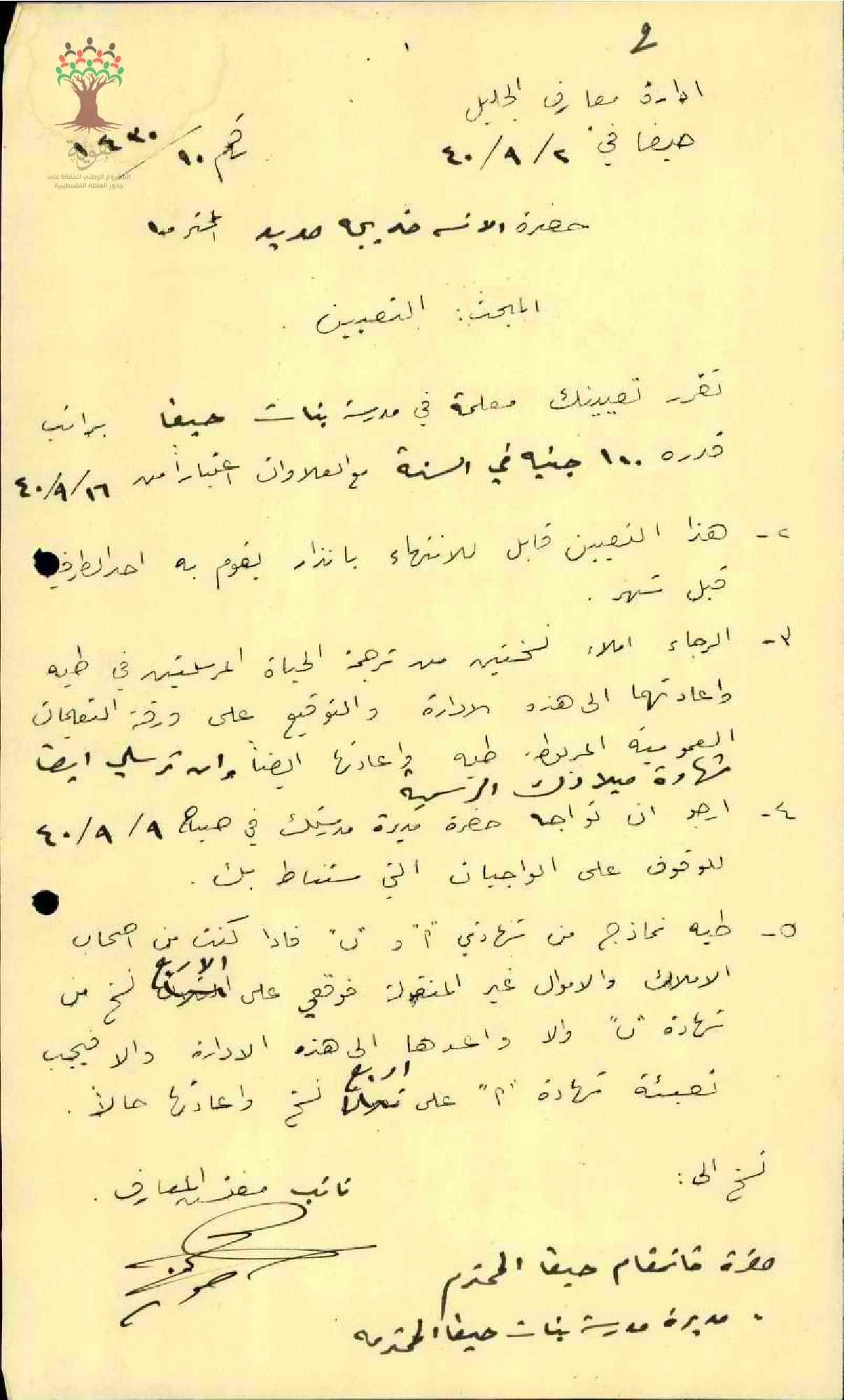 رسالة من نائب مفتش المعارف الى المعلمة خديجة حديد بخصوص تقرير تعيينك معلمة في مدرسة بنات صفد