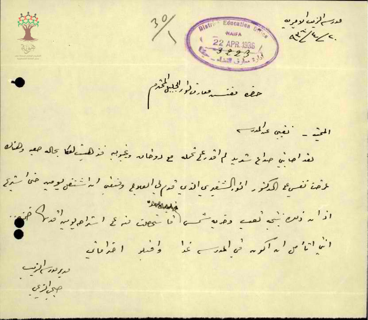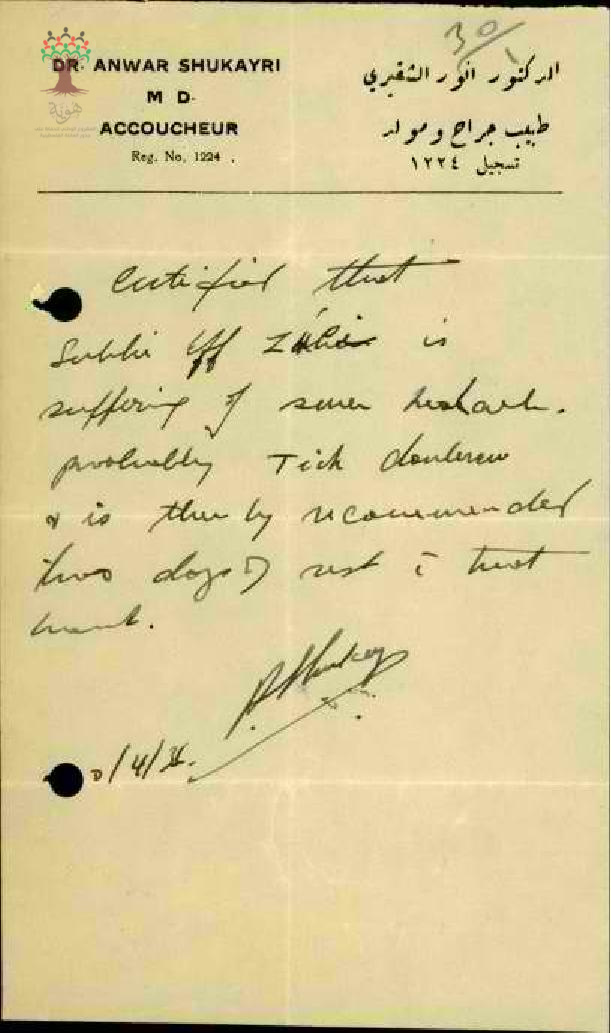 رسالة من المعلم صبحي الزعبي الى مفتش المعارف بخصوص تغيبه عن العمل مرفقة بالتقرير الطبي