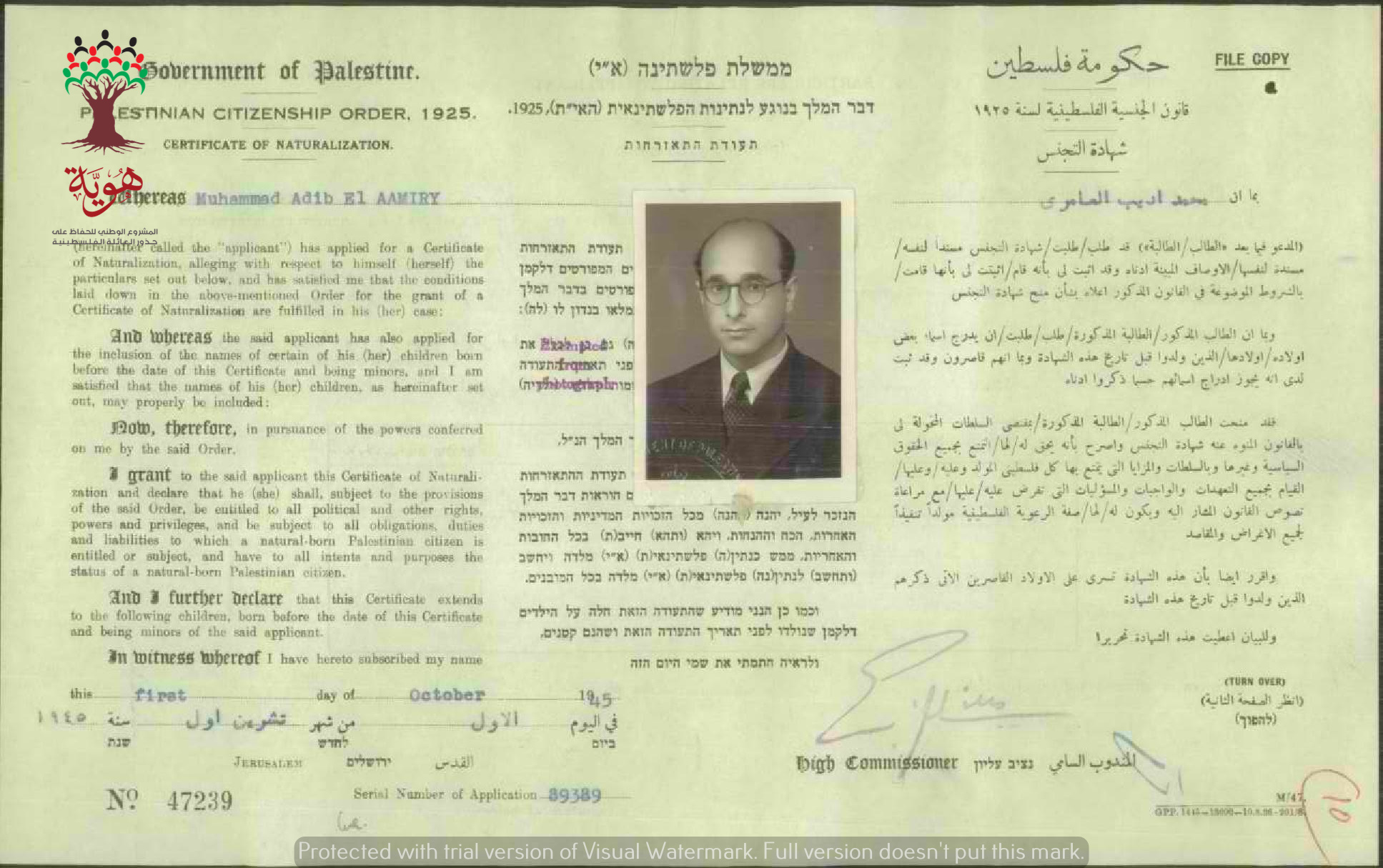 ضمن عمله الدؤوب في مجال الوثائق الفلسطينية، توقّف فريق "هوية" أمام وثائق نادرة تعود إلى أربعينيات القرن الماضي، تحكي فصلاً مهمًّا من سيرة أحد أبناء مدينة يافا، محمد أديب العامري، الذي تقدّم بطلب رسمي للحصول على الجنسية الفلسطينية مرتين: الأولى عام 1943 ولم يُكتب لها النجاح، والثانية عام 1945 حيث حصل بموجبها على الجنسية الفلسطينية رسميًا.