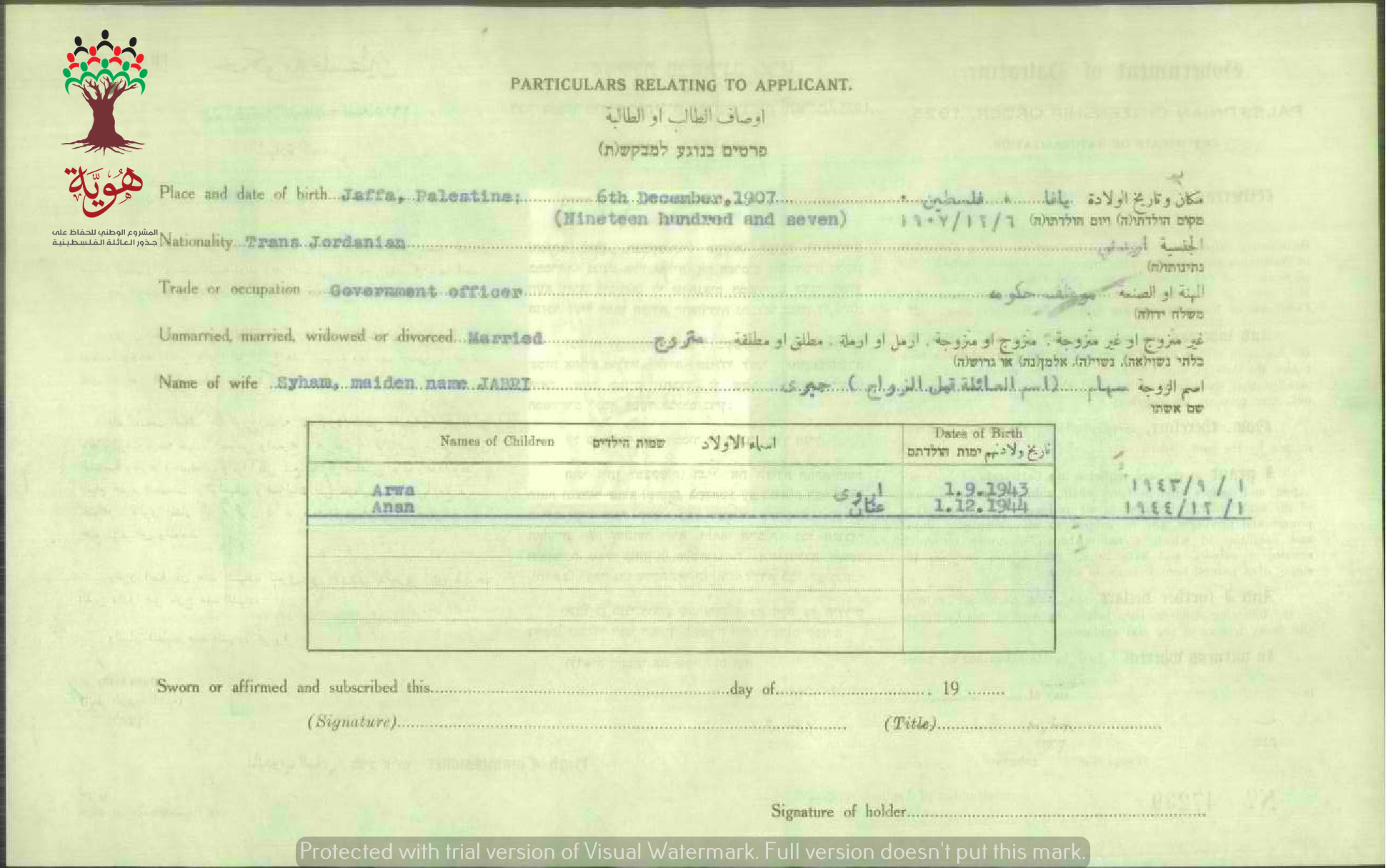 الوثائق المحفوظة بعناية منذ أكثر من سبعة عقود، تُظهر أن محمد أديب العامري، المولود في يافا عام 1907، كان متزوّجًا من السيدة سهام جبري، المولودة في دمشق عام 1909، ولهما من الأبناء أروى وعنان. وقد ورد في وثيقة أن مهنته “موظف في حكومة فلسطين” دون تفصيل.