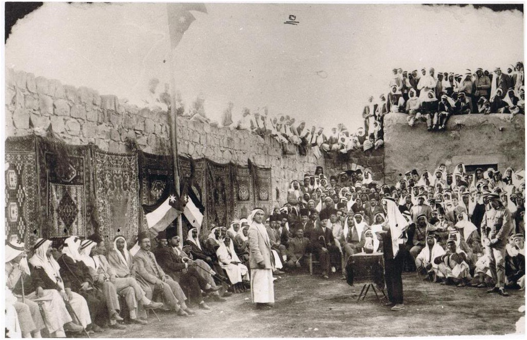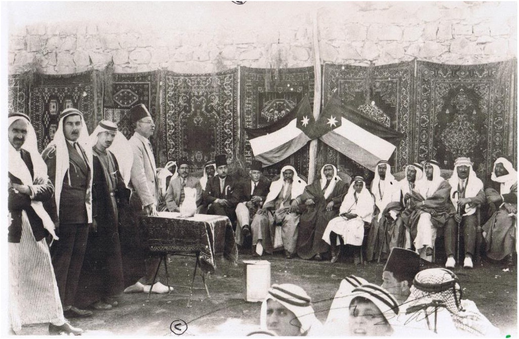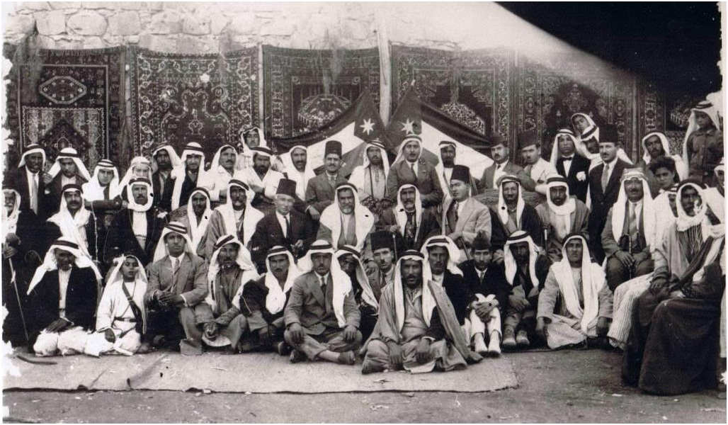 الصف الثاني من اليمين: الأستاذ ناجي أبونوار، حسين باشا الطراونة، الشيخ عضوب الزبن، الأمير راشد الخزاعي، الشيخ سليمان السودي، الشيخ حديثة الخريشة، سالم باشا الهنداوي،الأستاذ شمس الدين سامي.