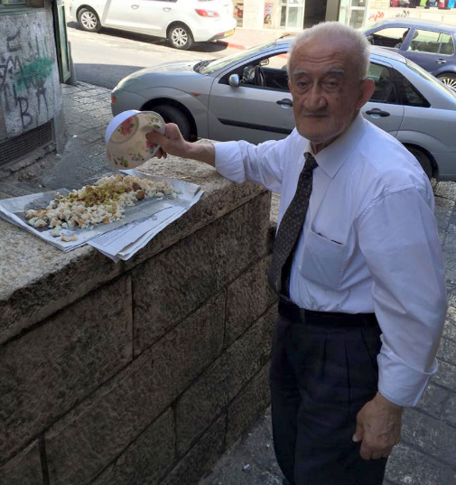 عصافير القدس وحمامها تعشق أبو ماهر، لقد عودها كل صباح ومساء أو ظهيرة أن تأتي "مائدته"، حيث وجبة الخبز المنقوع بالماء الموضوعة بآنية عند مدخل المحل،