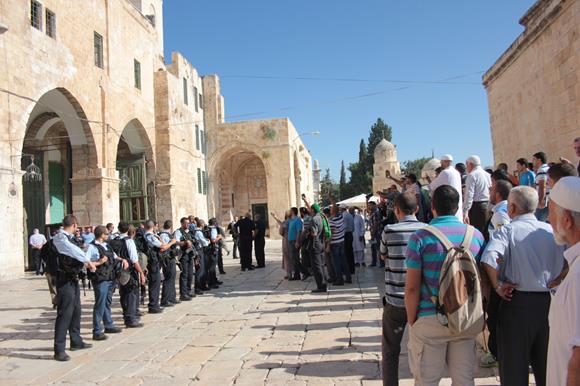 ويشهد المسجد الاقصى تواجدا ملحوظا من قوات الاحتلال الخاصة التي تنتشر في أنحاء المسجد وخاصة حول مساطب العلم .
