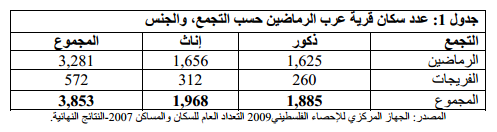 بين تعداد السكان الفلسطيني الذي جرى عام 2007، أن عدد سكان قرية عرب الرماضين بلغ 3,853 نسمة، منهم 3,281 شخصا يسكنون قرية الرماضين، و572 شخصا يسكنون عرب الفريجات (انظر الجدول رقم 1). وبلغ عدد الأسر 572 أسرة، وعدد الوحدات السكنية 665 وحدة، وبلغ متوسط حجم الأسرة 7 أفراد.