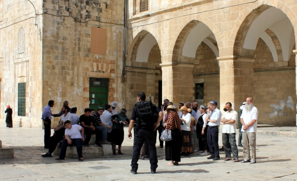 اقتحم عدد من المستوطنين الإسرائيلين صباح الأربعاء 22/4/2015 المسجد الأقصى المبارك بمدينة القدس المحتلة بحراسة مشددة من شرطة الاحتلال من جهة باب المغاربة.