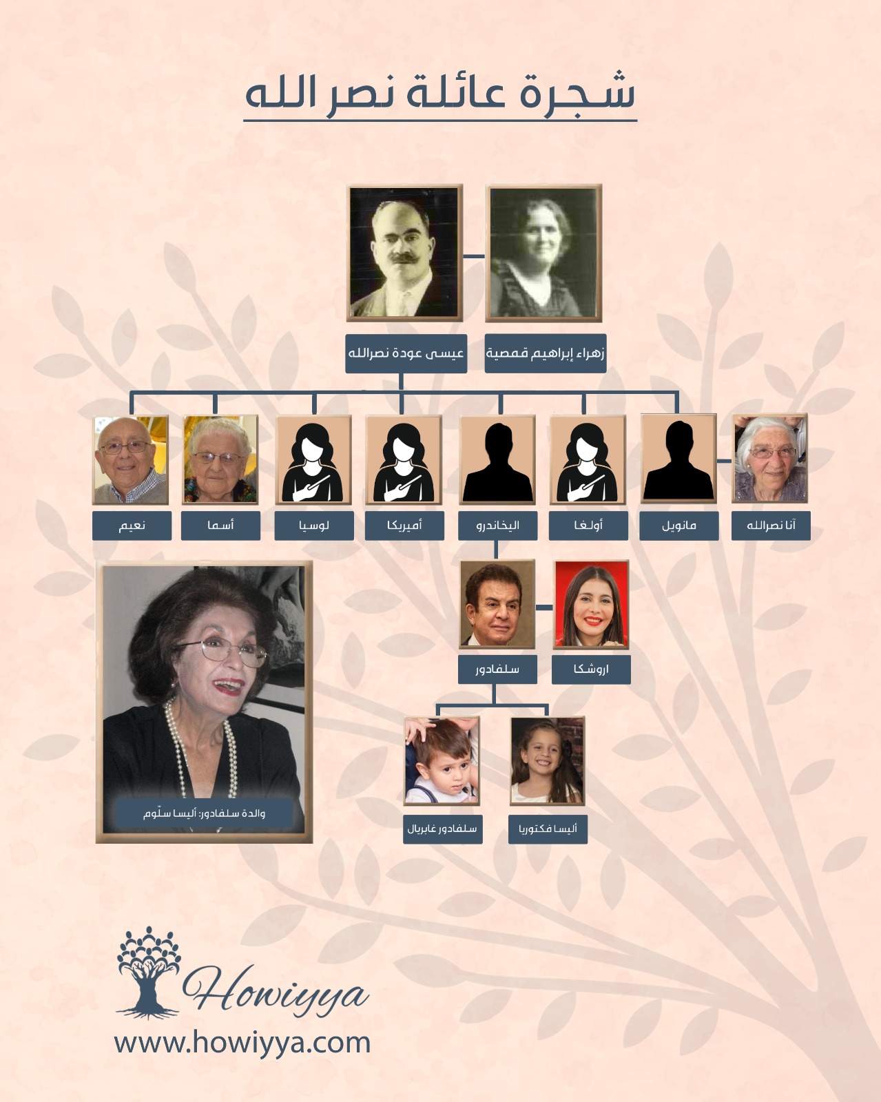 قدمت المؤسسة شجرة العائلة الموثقة، والتي تؤكد أسماء أعمام وعمات المرشح سلفادور نصر الله، الذين لم يُكشف عنهم إعلامياً بدقة، وهم: