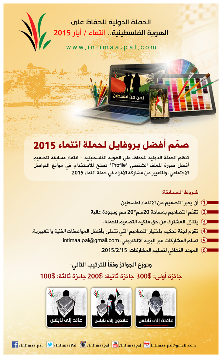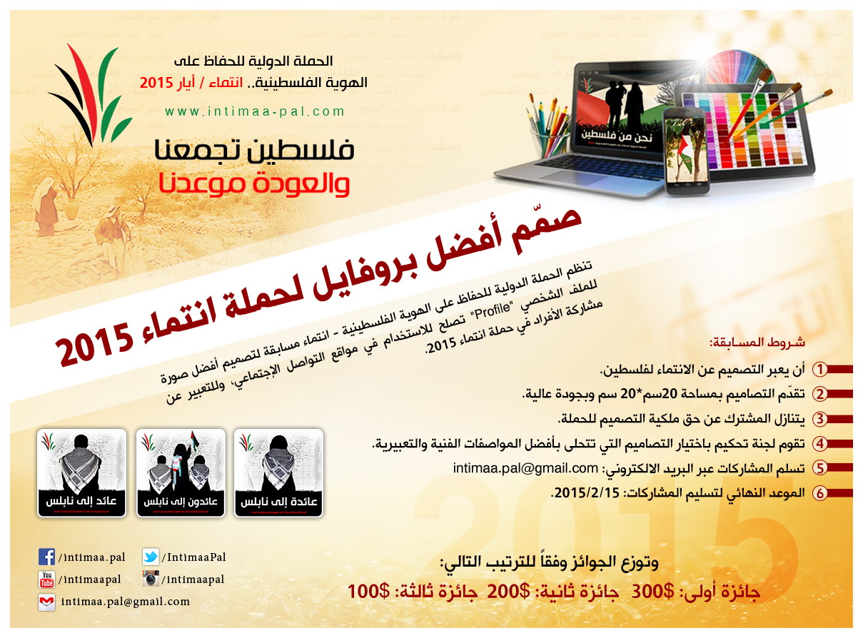 تنظم الحملة الدولية للحفاظ على الهوية الفلسطينية – انتماء مسابقة لتصميم أفضل صورة للملف الشخصي " Profile " تصلح للاستخدام في مواقع التواصل الاجتماعي، وللتعبير عن مشاركة الأفراد في حملة انتماء 2015.