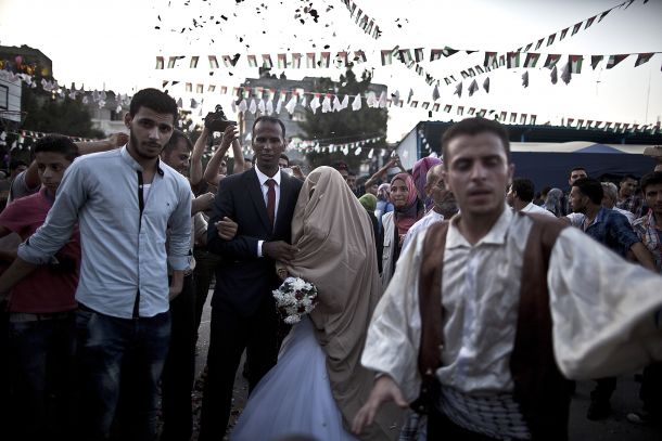 وأقيم حفلا لزفاف عمر أبو نمر (٣١ عاما)، وعروسه هبة فياض (٢٤ عاما)، داخل مركز إيواء للنازحين، يقع في مدرسة تابعة لوكالة "أونروا"، في مخيم الشاطئ غرب مدينة غزة.