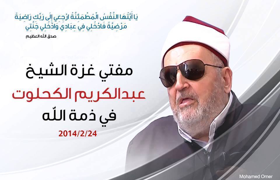 توفي الشيخ عبد الكريم الكحلوت مفتي مدينة غزة، مساء الإثنين، عن عمر يناهز 78 عامًا، بعد تدهور حالته الصحية ورقوده في العناية المركزة منذ ثلاثة أيام بمستشفى الشفاء بغزة.