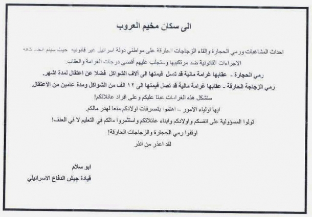 وأضاف بأن منشوراً آخراً للجيش تم توجيهه إلى سكان المخيم يحذرهم من فرضه لغرامات مالية قد تصل إلى 12 ألف شيقل بالإضافة لعامين من الاعتقال ضد من يتورط بإلقاء زجاجة حارقة، أما من يلقي الحجارة فعقوبته آلاف الشواقل وعدة أشهر من الاعتقال.