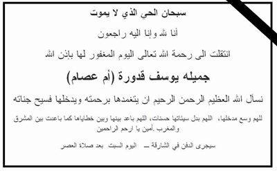 ومناسبة مرور ثلاثة ايام على وفاة المرحومة جميلة يوسف قدورة اقيم حفل تأبين على روحها الطاهرة في قاعة مسجد الزعتري/صيدا.