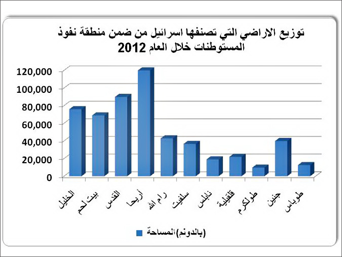 وينسب التقرير إلى صحيفة "هآرتس" الإسرائيلية قولها إن مساحة نفوذ المستوطنات ازدادت 7,372دونما (7.4 كم²) في العام 2012 لتصبح 538,303 دونما (538.3 كم²) مع نهاية العام 2012 بعدما كانت المساحة تبلغ 530,931 دونما (531 كم²).