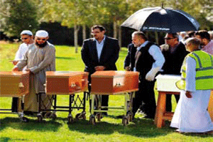 لم تغب عن الأب المكلوم واجبات الدين الحنيف، فطلب ممن حوله، أن يسرعوا في مراسم دفن العائلة، عملاً بالقول: إن إكرام الميت دفنه. في المقبرة الإسلامية في لندن، كان الموعد مع وداع الأبناء.