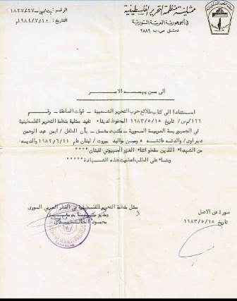 كتب في الأوراق: "تفيد ممثلية منظمة التحرير الفلسطينية في الجمهورية العربية السورية –مكتب دمشق- بأن الطفل أيمن عبد الرحمن الديراوي/ والدته عائشة من مواليد بيروت/ لبنان عام 11-6-1982، والداه من الشهداء الذين سقطوا أثناء الغزو الصهيوني للبنان..".